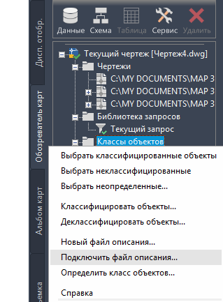 - Подключите файл описаний объектов, щелкнув правой кнопкой "Классы объектов" на вкладке "Обозреватель карт" панели задач и выберите "Подключить файл описания".