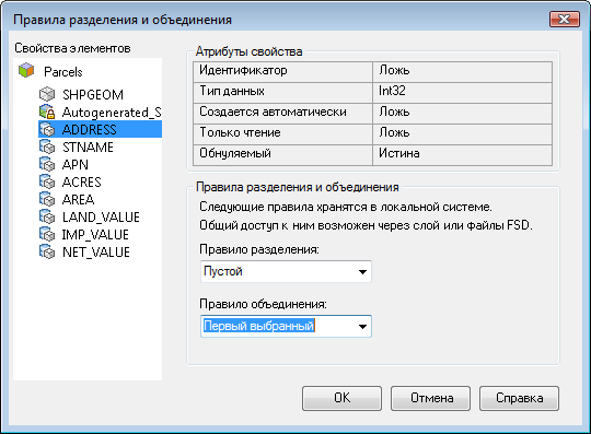 Используя Разделение можно установить правила назначение свойств при разделении и объединении геопространственных элементов. Для этих правил можно использовать выражения.