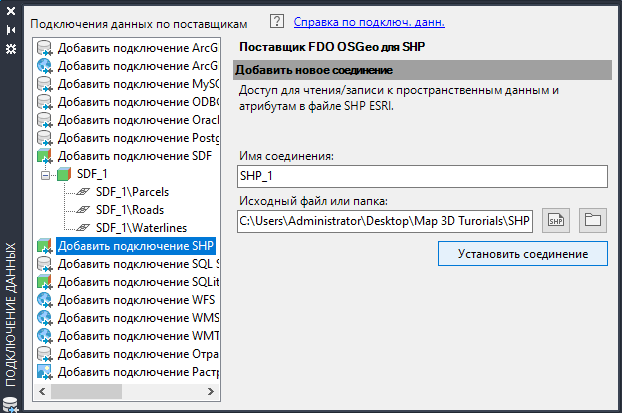 Создайте новую папку для файлов SHP. Для преобразования и копирования данных в формат SHP необходимо подключиться к этой папке. Используйте окно "Подключение данных", чтобы подключиться к хранилищам данных, даже если никакие данные не добавляются на карту из хранилища данных.