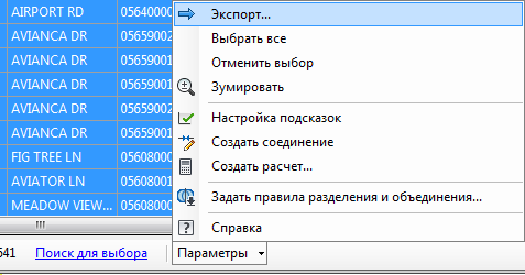 Отобразите Таблицу данных для участков в зоне строительства. Экспортируйте данные в файлы CSV. Данные можно использовать по своему усмотрению. Например, их можно использовать в отчете или для создания списка рассылки для владельцев земельных участков, находящихся в зоне строительства.