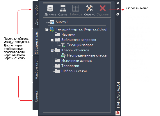 Панель задач предоставляет быстрый доступ к часто используемым функциям, группируя эти функции по задачам, для выполнения которых они предназначены. С помощью панели задач можно создавать, отображать и публиковать карты, а также управлять ими.