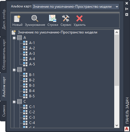 Используйте вкладку "Альбом карт" для печати карт, альбомов карт, многостраничных карт в формате DWF из стилизованных карт. На вкладке "Альбом карт" используется Диспетчер подшивок AutoCAD. Он обеспечивает доступ к альбому карт, в котором имеется дерево фрагментов, напоминающее страницы в атласе. Используйте стрелки навигации для перемещения по фрагментам карты.