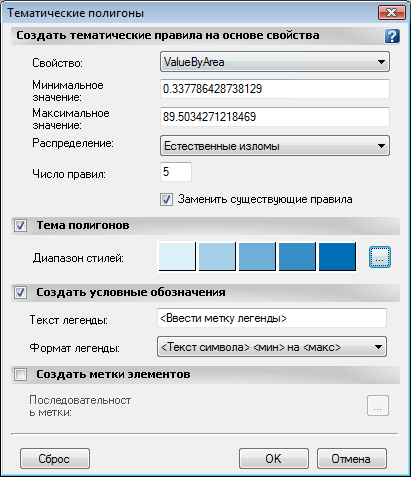 Метод распределения "Естественные изломы" группирует диапазоны элементов по их естественным разрывам, поэтому элементы с похожими значениями располагаются вместе. Этот метод отображает естественное группирование данных, а не создает случайные точки разрыва.