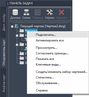 Подключите чертежи, находясь на вкладке "Обозреватель карт" панели задач.