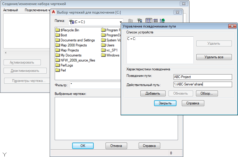 Псевдоним диска позволяет нескольким пользователям использовать один и тот же путь для чертежа, сохраненного на общем диске. Таким образом, каждый пользователь может назначить для диска свою букву.