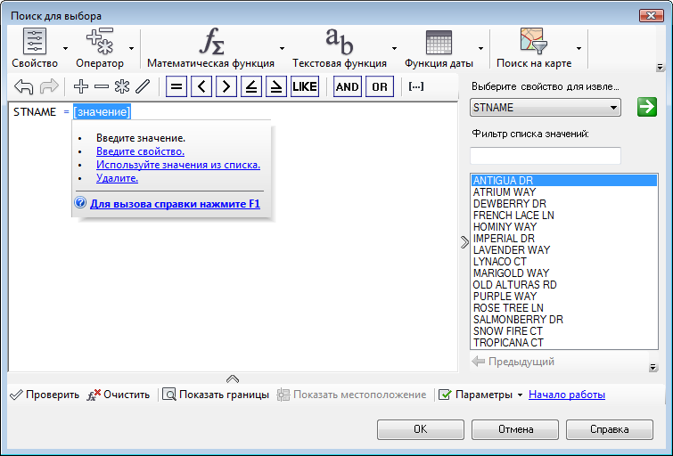 Список свойств заполняется при нажатии зеленой стрелки. Этот выбор заменяет ранее выбранное значение.