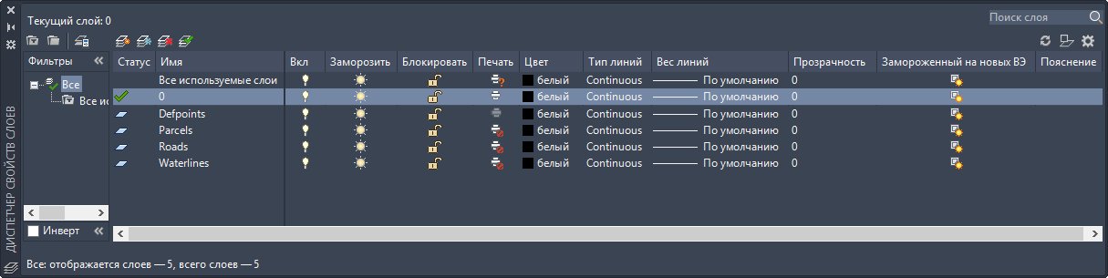 В списке перечислены слои чертежа и их свойства.
