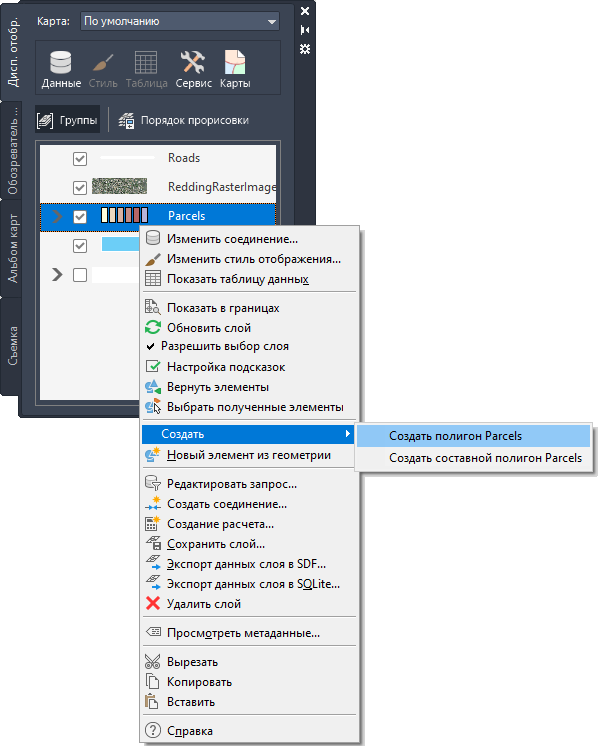 Каждый элемент инструментарий AutoCAD Map 3D имеет настроенное меню с командами, доступными для этого элемента в данный момент.