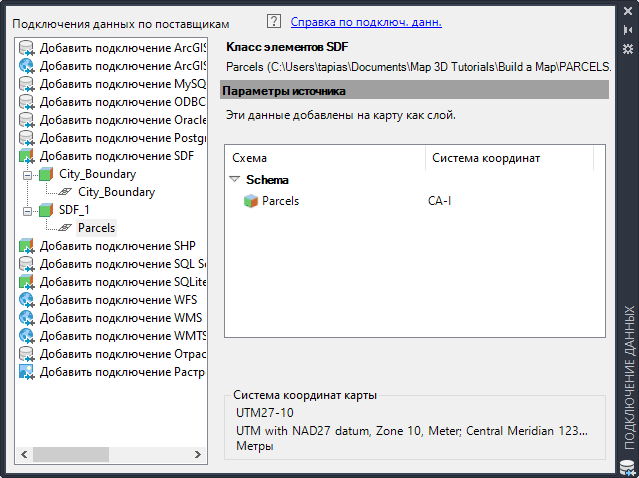 В окне "Подключение данных" отображается информация обо всех подключенных источниках данных, отличных от файлов DWG, даже если для их подключения не используется окно "Подключение данных". Например, перемещенный на карту файл SDF отобразится в списке диалогового окна "Подключение данных".