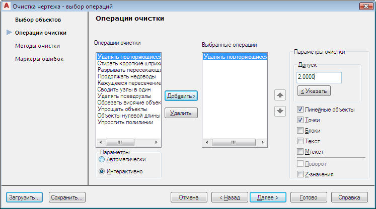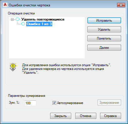 Функция "Очистка чертежа" находит ошибки на чертеже и выводит диалоговое окно "Ошибки очистки чертежа". В этом окне ошибки сгруппированы по типам. Выделено "Удалять повторяющиеся".
