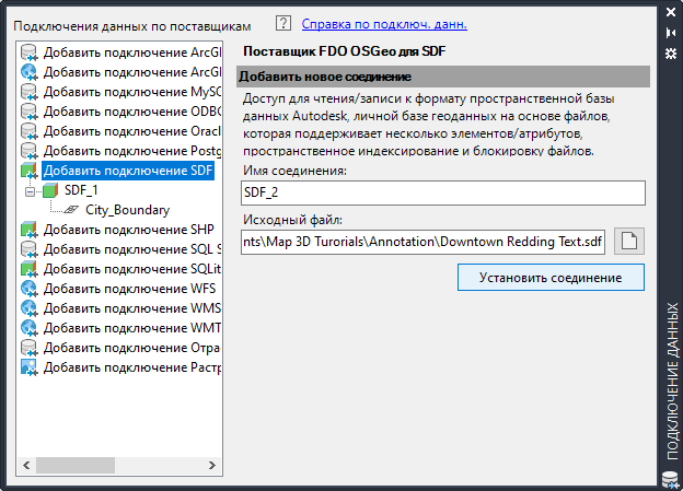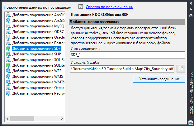 - В открытом окне "Подключение данных" в списке "Подключения данных по поставщикам" еще раз выберите "Добавить подключение SDF".
