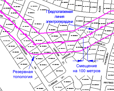 "Анализ буфера" используется, чтобы показать область вокруг существующей топологии. В данном случае анализ буфера топологии энергосети создает новую полигональную топологию.