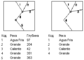 При реструктуризации сетевой топологии в инструментарий AutoCAD Map 3D выполняется проверка узлов между линиями на предмет пересечения двух линий в указанном узле, а также на наличие одинакового поля реструктуризации. Если это так, узел удаляется, а две связи объединяются и образуют одну связь. Все поля объекта удаляются, кроме поля реструктуризации и каких-либо полей новой топологии, как показано на следующей иллюстрации.