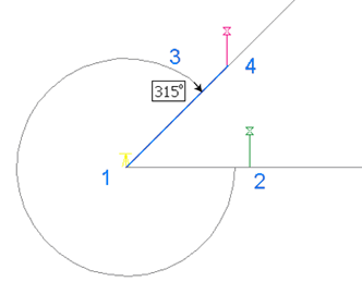 Выберите линию, от которой измерять угол. Это может быть как существующая линия на чертеже, так и новая, заданная путем указания начальной и конечной точки (1 и 2). Затем задайте угол (3) и расстояние от начальной точки (4).