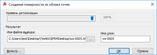 - Выберите данные облака точек на чертеже. Для завершения выбора нажмите клавишу Enter. Появится диалоговое окно Создание поверхности из облака точек.