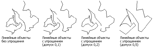 Когда используется операция "Упростить объекты", производится упрощение сложных полилиний путем удаления всех внутренних точек, которые попадают в пределы заданной ширины допуска. Сегменты полилиний, попадающие в такой же коридор, обобщаются в единую полилинию. Ветвящиеся точки, тупиковые участки и конечные точки полилиний обобщению не подлежат.