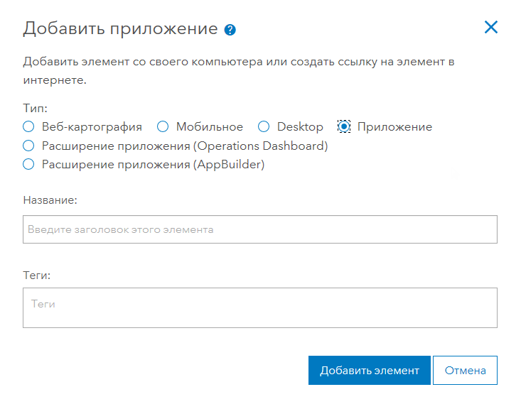 - В диалоговом окне «Добавить приложение» выберите «Приложение», введите соответствующий заголовок и теги, затем нажмите «Добавить элемент».