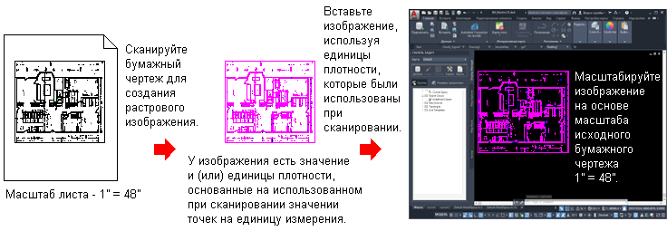 Следующий пример показывает отношение между масштабом листа, единицами измерения плотности и масштабом вставки изображения без геометрических данных (изображение, которое было сохранено без данных реальных единиц измерения). В эту категорию попадает любое изображение, которое было нарисовано с использованием масштаба (например, план этажа) и отсканировано.