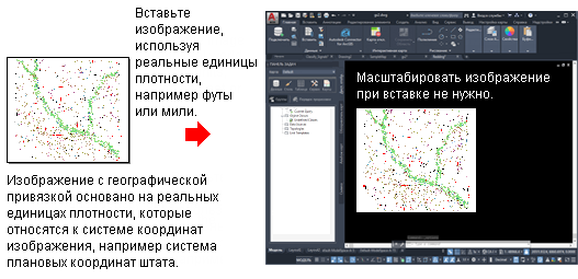 Заданная единица измерения плотности может отличаться в зависимости от типа вставляемого изображения. Следующие два примера приведены для объяснения различий между вставляемым отсканированным изображением, которое измеряется в точках на дюйм, и аэро/спутниковой фотографией, единицы измерения которой являются реальными.
