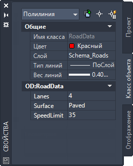 При выборе дороги на чертеже на вкладке "Класс объектов" будут отображаться все свойства, связанные с классом объектов "Дорога". Измените значение, щелкнув мышью в окне и выбрав элемент из списка.