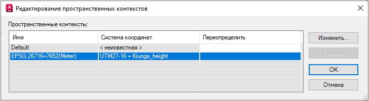 - Выберите элемент «Изменить системы координат» и в диалоговом окне «Редактирование пространственных контекстов» щелкните соответствующую запись.