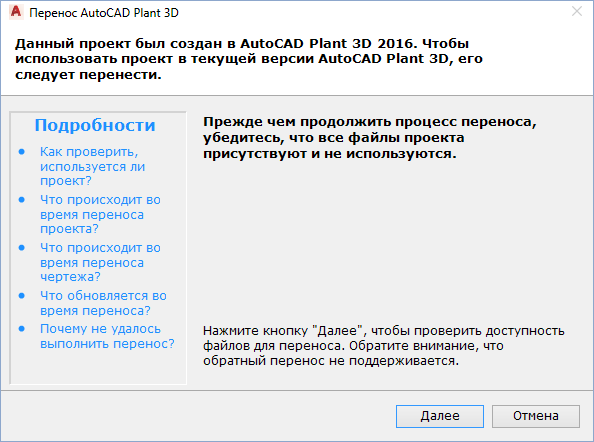 Страница запуска переноса проекта сообщает, допустим ли к переносу проект, который вы пытаетесь открыть в AutoCAD Plant 3D toolset. Перед попыткой переноса не забудьте закрыть проекты и все связанные с ними файлы чертежей.
