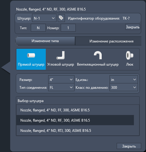 Используется для отображения списка доступных штуцеров в соответствии с заданными фильтрами. Выберите штуцер, который необходимо изменить или добавить.