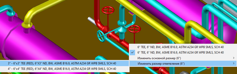 Для таких фитингов, как переходные фитинги, может потребоваться отдельно изменить основной размер и переходной размер или заменить фитинг с двумя выводами на фитинг с тремя выводами. Расширенные параметры в меню подстановки упрощают процесс замены переходных фитингов в 3D-моделях.