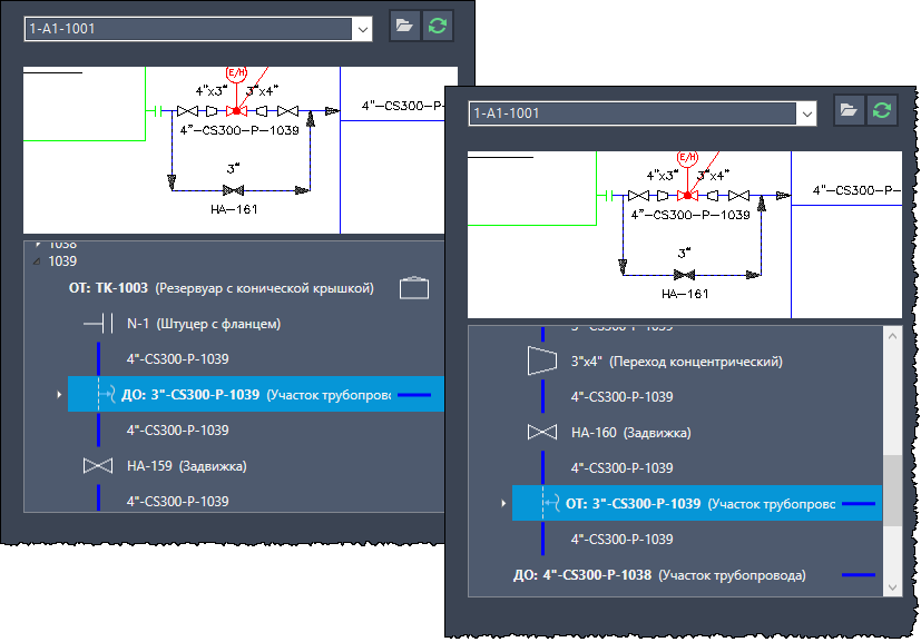- Для групп линий, которые соединены межстраничными соединениями в рамках нескольких чертежей P&ID, в дереве отображаются начальные и конечные компоненты из другого чертежа P&ID.