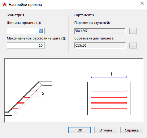 Задает параметры геометрии пролетов. Числовые значения, указанные в скобках, соответствуют геометрии, обозначенной в образце для просмотра.