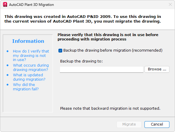 Рекомендуется создать резервную копию чертежа на тот случай, если его потребуется дорабатывать в AutoCAD P&ID 2011.