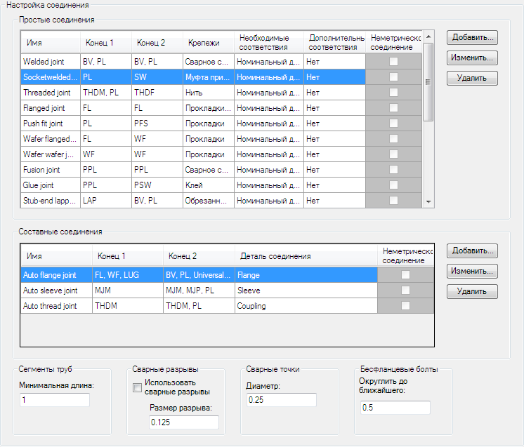 Позволяет настроить простые и составные типы соединений. Также здесь задаются минимальная длина сегмента трубы, настройки отображения соединения и коэффициенты округления болтов.
