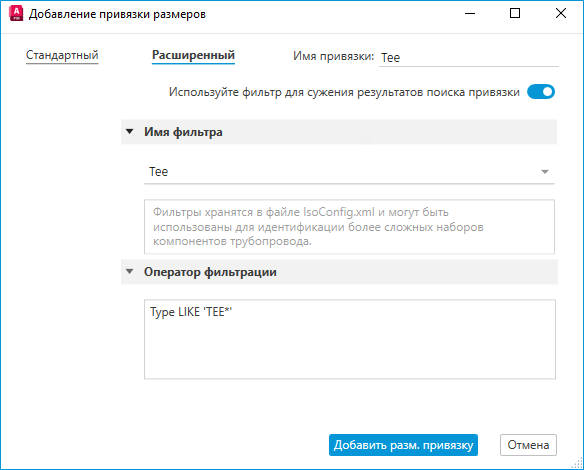 Возможность фильтрации для задания привязки с целью выбора любого существующего фильтра в качестве размерной привязки или исключения. Фильтры хранятся в файле IsoConfig.xml и могут быть использованы для идентификации более сложных наборов компонентов трубопровода.