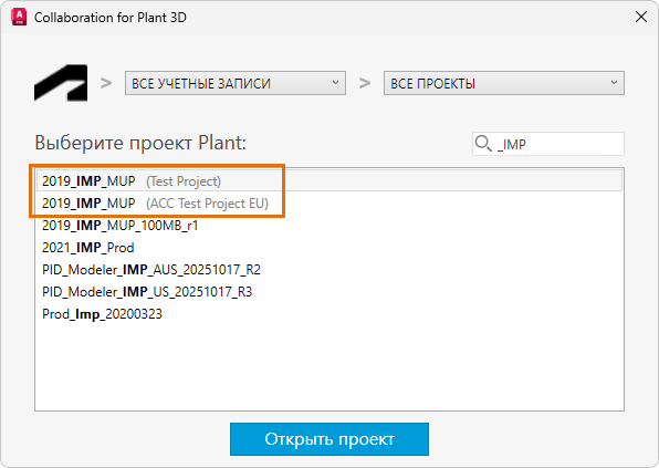 При открытии совместного проекта можно выбрать проект Plant в учетной записи Forma Data Management при наличии необходимых прав доступа.