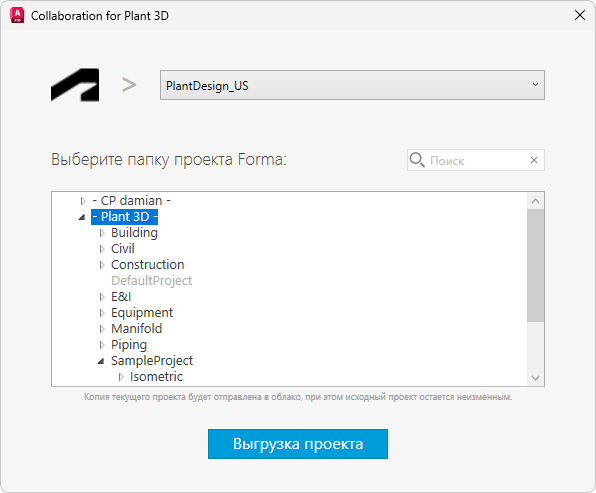 Forma Data Management позволяет совместно работать над проектами во вложенных папках, что особенно полезно при совместном использовании проекта Plant в облаке.