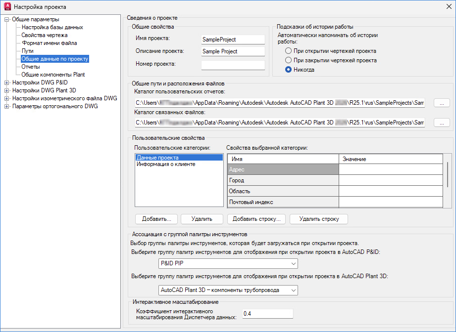 В диалоговом окне "Настройка проекта" слева отображается древовидная структура, которая заполняется элементами, именуемыми узлами дерева. При выборе узла дерева справа отображается связанное с этим узлом содержимое, в которое можно внести изменения или дополнения к настройке проекта.