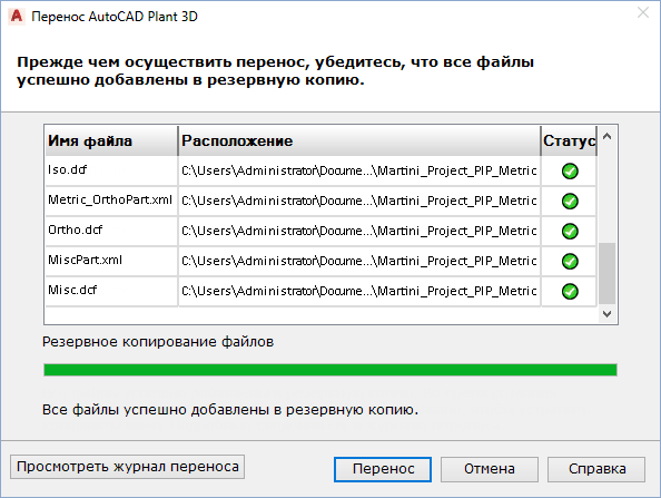 При выборе резервного копирования файлов проекта мастер переноса проектов автоматически выполнит резервное копирование. В резервную копию включаются файлы, необходимые для проекта, а также любые дополнительные файлы, выбранные для добавления в резервную копию. В таблице динамически отображаются имя каждого файла и путь к нему.