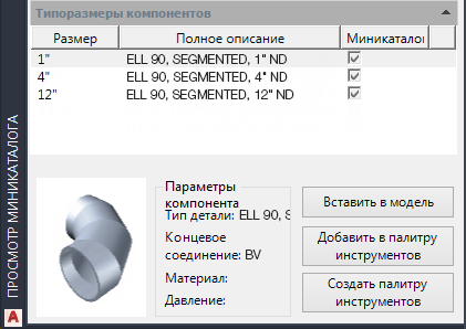 Изменение компонентов трубопровода в мини-каталоге