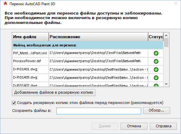 Имеется возможность создать резервные копии проекта и связанных с ним файлов. Рекомендуется выполнить резервное копирование файлов проекта, чтобы в дальнейшем можно было при необходимости их открывать и редактировать в версии AutoCAD P&ID, в которой они были созданы.