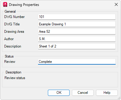 В диалоговом окне "Свойства чертежа" отображаются добавленные вами свойства. При необходимости воспользуйтесь полосой прокрутки для отображения свойств.