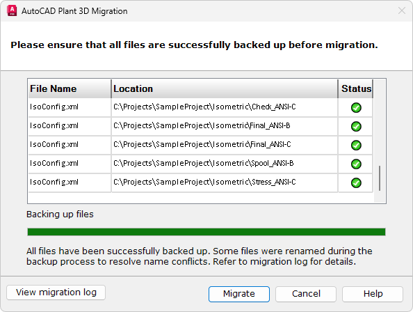 - Нажмите кнопку "Далее". На странице "Резервное копирование при переносе проекта" отображается ход выполнения резервного копирования, а также сообщается об успешном создании резервной копии каждого из файлов.