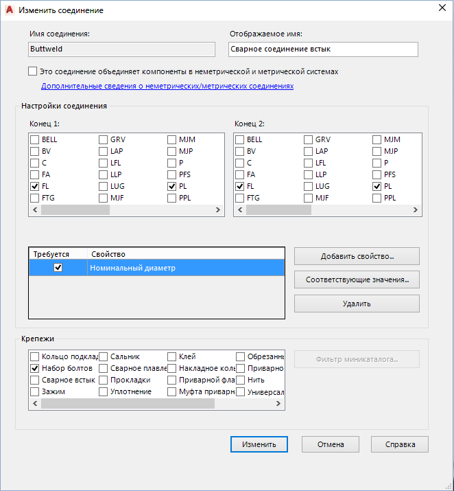 Задает конечные типы, которые соединяет соединение, и используемые крепежи (при их наличии).