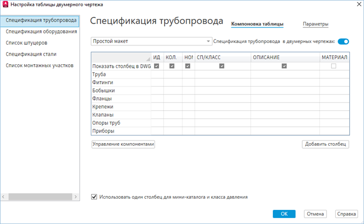 Настройка типа и столбцов таблицы спецификации двумерного чертежа.