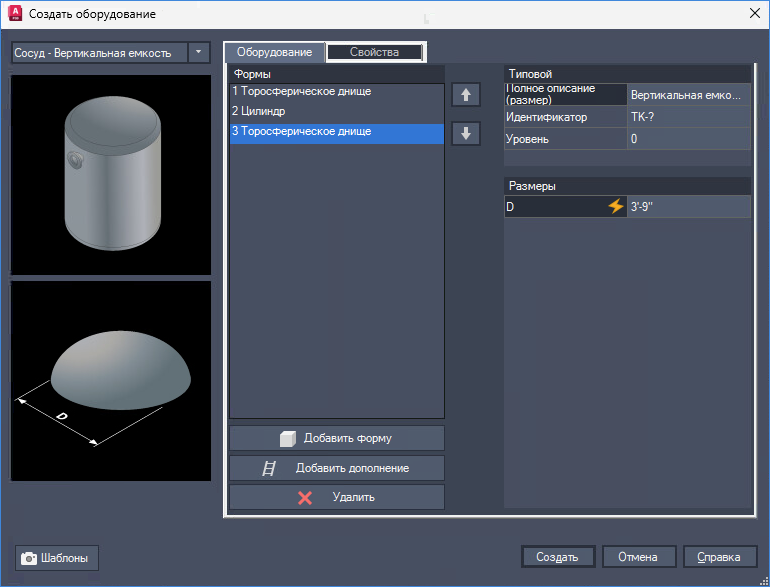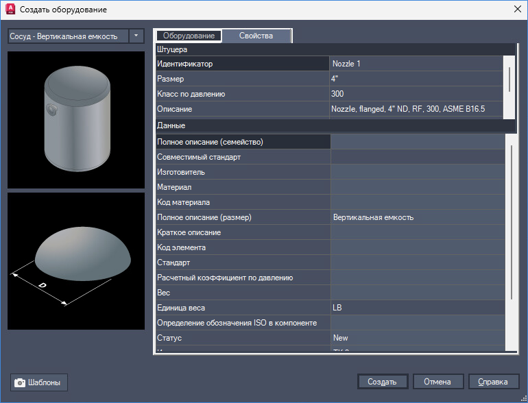 В раскрывающемся списке "Создать оборудование" выберите класс оборудования (например, емкость). Во всплывающем меню выберите «Создать <тип оборудования>» (например, «Создать вертикальную емкость»).