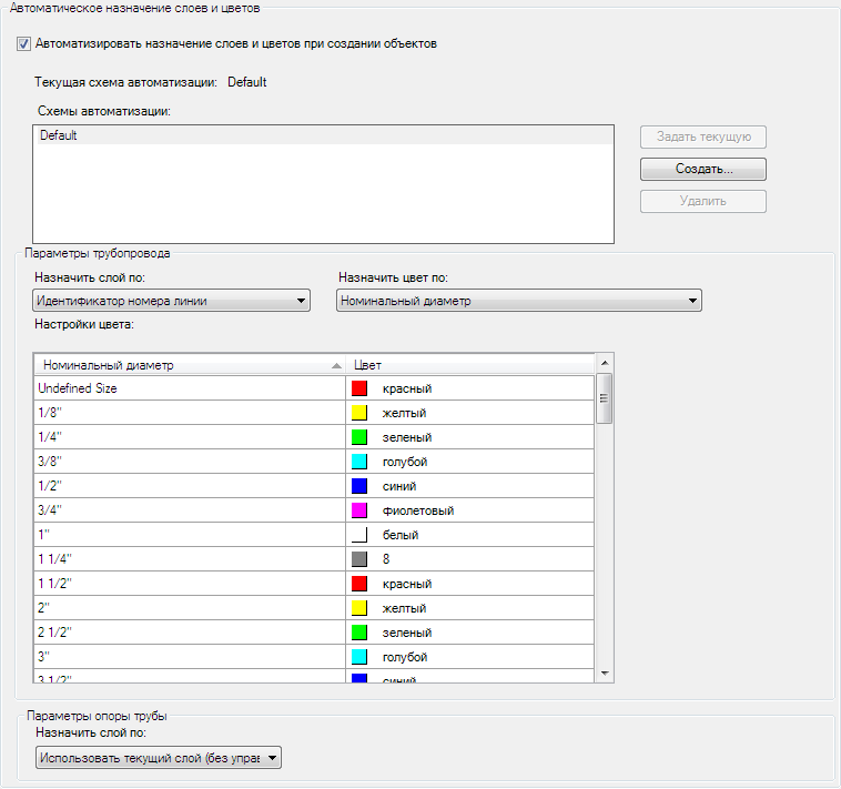 Задает автоматическую схему для присвоения значений слоев и цветов трубопроводам и связанным встраиваемым компонентам.