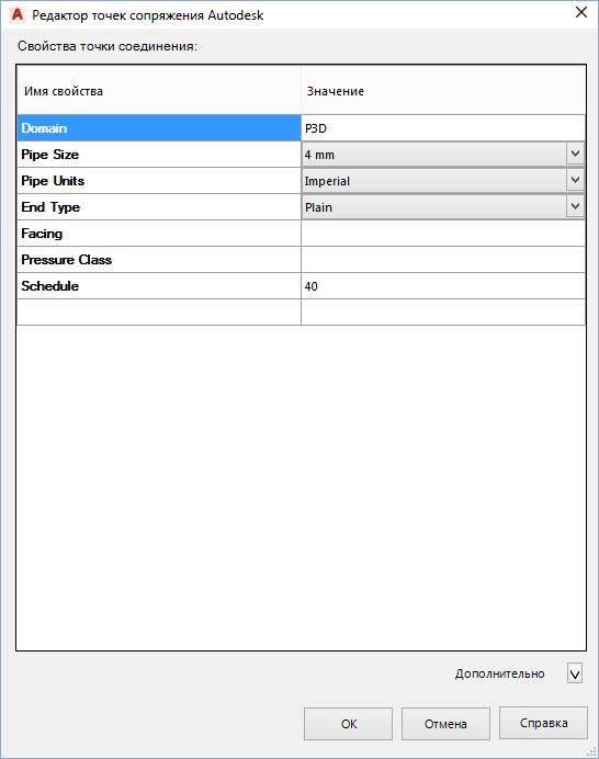 - Отображает значения для свойств. Для присоединительного патрубка, созданного с помощью plantinsertautodeskconnectionpoint, свойство "Домен" имеет значение P3D.