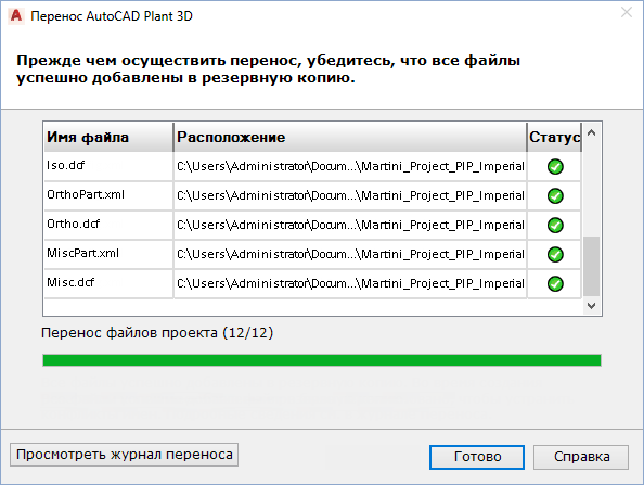Процесс переноса может занять длительное время, в зависимости от размера проекта и количества связанных с ним чертежей. В таблице "Ход выполнения переноса" сообщается, был ли успешно выполнен перенос файла или же его выполнить не удалось. Также отображается ход выполнения переноса. После успешного переноса всех файлов проект открывается в AutoCAD Plant 3D toolset.
