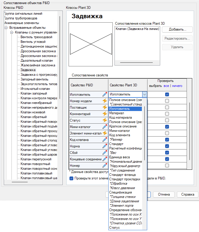 - В области «Сопоставление объектов P&ID» в разделе «Классы P&ID» разверните структуру и щелкните объект P&ID, в который было добавлено свойство (например, Клапан).
