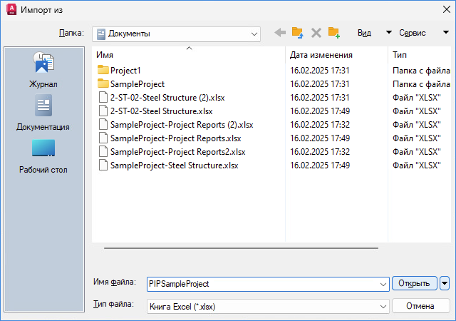 Открытие диалогового окна "Импорт данных" или "Выбор листа", в зависимости от того, что импортируется: данные проекта, данные чертежа или отчет о проекте.