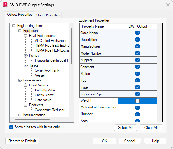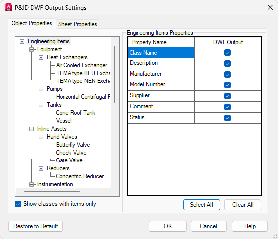 - В диалоговом окне "Параметры вывода" на вкладке "Свойства объекта" установите флажок "Показывать только классы с элементами".